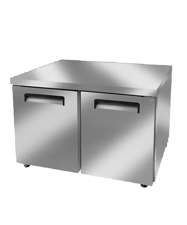 - Mesa congeladora para colocar bajo mostradores: Superficie (top) plana de acero inoxidable que le permite trabajar alimentos o ser ubicada fácilmente debajo de mostradores.